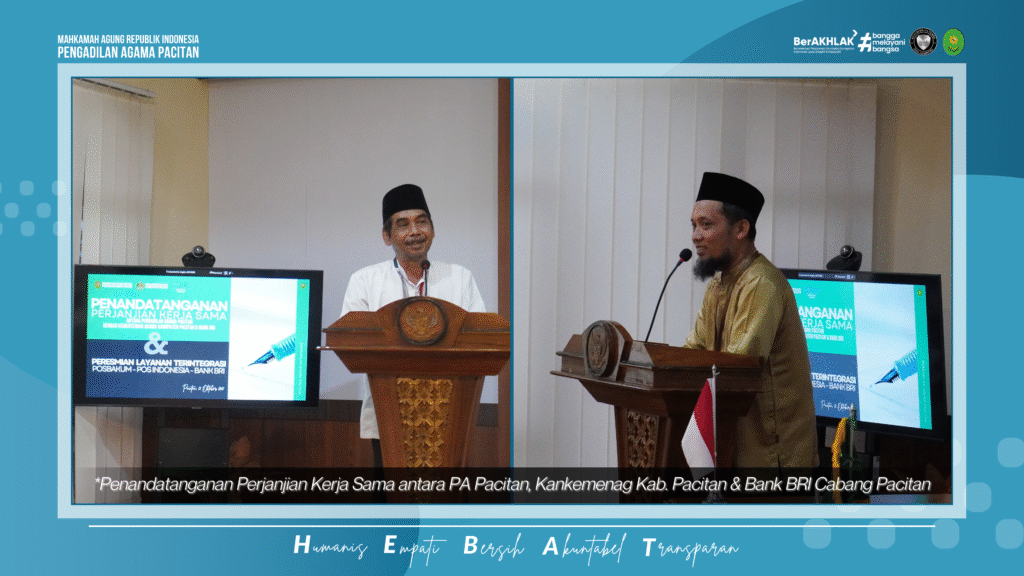 Pacitan, 22 Oktober 2025 – Pengadilan Agama Pacitan menggelar acara penandatanganan perjanjian kerja sama dengan Kementerian Agama Kabupaten Pacitan dan Bank BRI Cabang Pacitan pada Rabu, 22 Oktober 2025. Kegiatan tersebut sekaligus dirangkaikan dengan peresmian layanan terintegrasi PA Pacitan bersama sejumlah mitra kerja. Acara berlangsung di ruang Media Center PA Pacitan dengan suasana khidmat dan penuh kebersamaan. Turut hadir Kepala Kantor Kementerian Agama Kabupaten Pacitan, H. Baharuddin, serta Kepala Cabang BRI Pacitan, Yudika Hanafi. Momentum ini juga bertepatan dengan peringatan Hari Santri Nasional tahun 2025 yang menambah makna tersendiri bagi seluruh peserta.