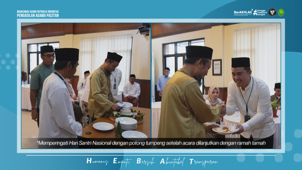 Sebagai penutup rangkaian kegiatan, dilaksanakan acara peringatan Hari Santri Nasional tahun 2025 yang ditandai dengan pemotongan tumpeng oleh Ketua PA Pacitan. Potongan tumpeng pertama diserahkan kepada Kepala Kantor Kementerian Agama Kabupaten Pacitan, H. Baharuddin, dan Kepala Cabang BRI Pacitan, Yudika Hanafi, sebagai simbol sinergi dan kekompakan antar lembaga. Seluruh tamu undangan kemudian menikmati sesi ramah tamah dalam suasana hangat dan penuh keakraban. Acara ini tidak hanya menjadi momentum seremonial, tetapi juga wujud nyata komitmen PA Pacitan dalam meningkatkan pelayanan publik berbasis kolaborasi. Dengan semangat Hari Santri Nasional, diharapkan kerja sama ini membawa manfaat besar bagi masyarakat Pacitan dan sekitarnya.